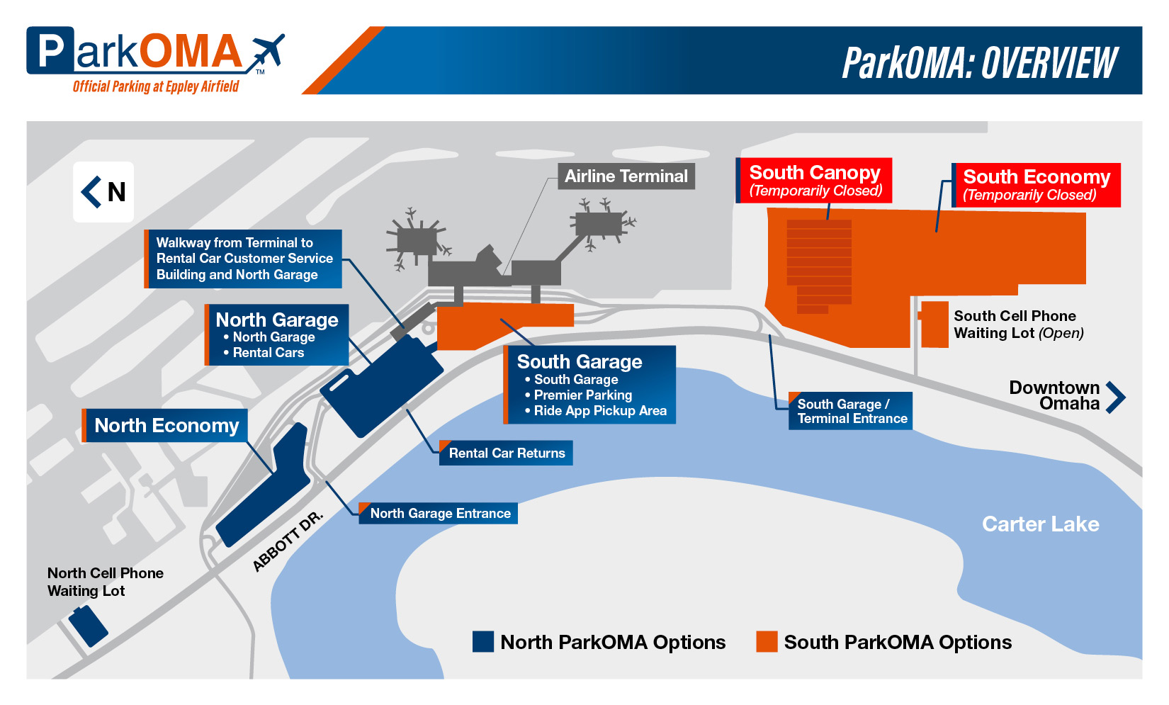 Please be sure to track flight arrival times on the FlyOMA app. Overnight parking is not available in either lot, and vehicles must be attended at all times. (ParkOMA Map)