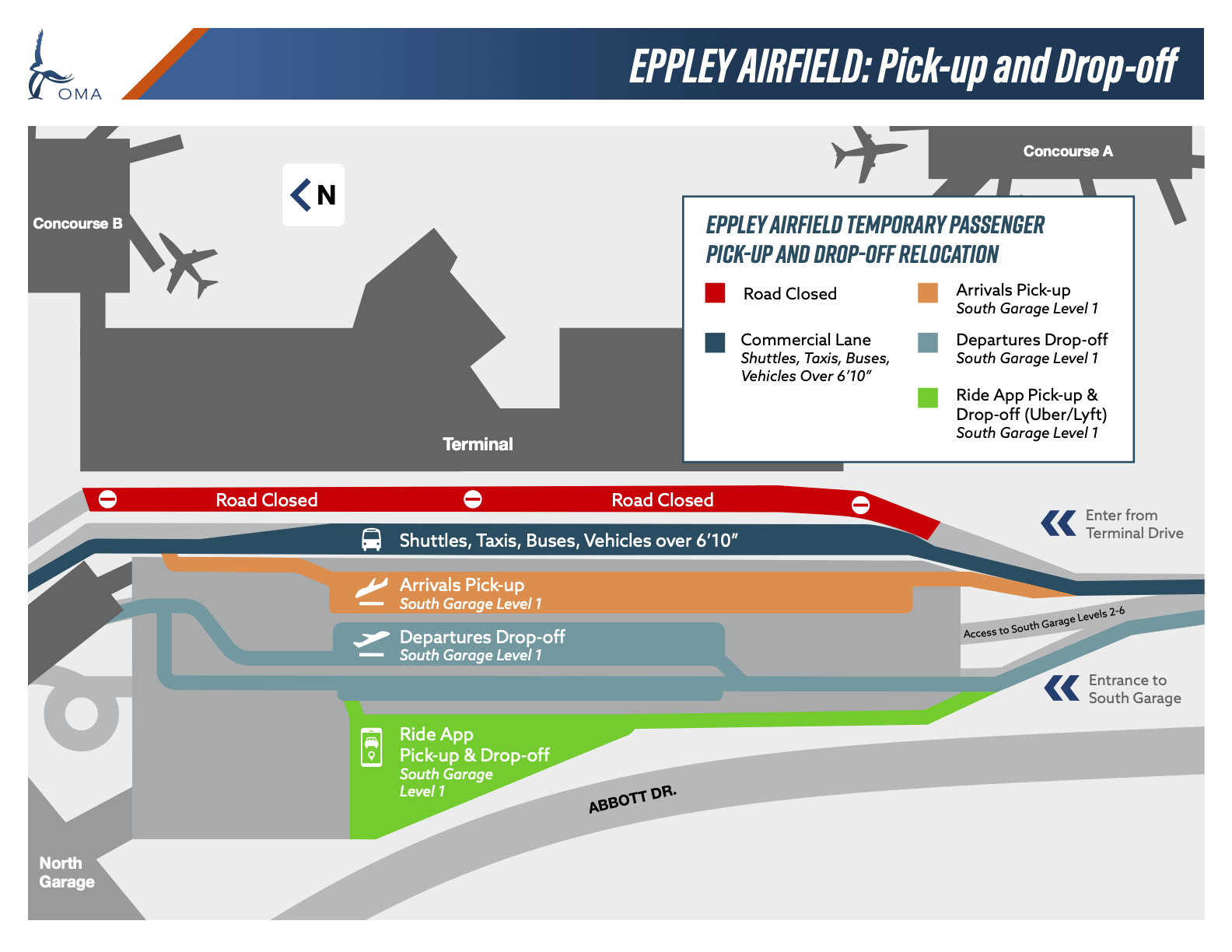 • During the Build OMA Terminal Drive & Canopy Project, the passenger pick-up and drop-off area is moving to the Level 1 of the South Garage. Travelers with disabilities can use the new pick-up and drop-off area or they may use the lane on the front drive that is designated for commercial vehicles. For additional assistance, please contact the Airport Communications Center at 402-661-8100. See the passenger pick-up and drop-off map for directions.